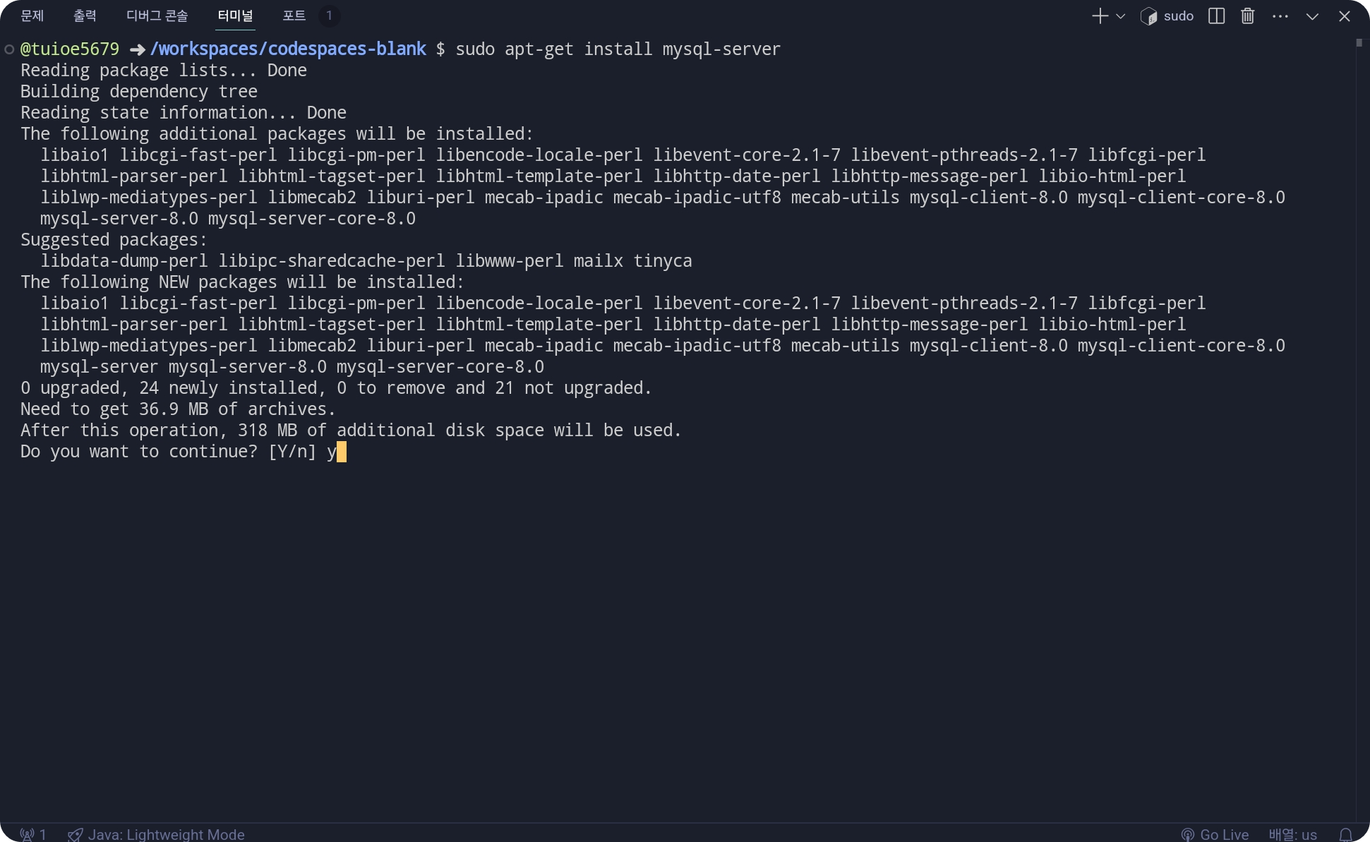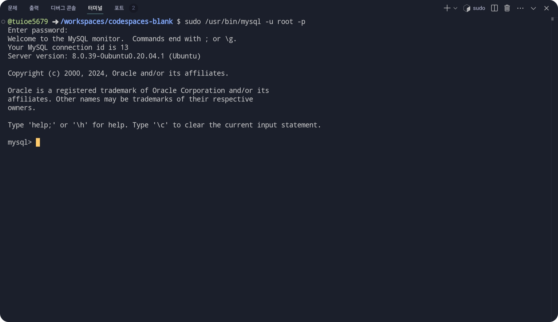 이렇게 클라이언트에 root 사용자로 접속까지 완료했습니다 이번에는 GitHub의 Codespaces를 활용해서 MySQL 설치 및 접속하는 방법에 대해서 포스팅해봤습니다 일반적인 Linux 기반에서도 동일한 방법으로 설치 및 접속이 가능합니다