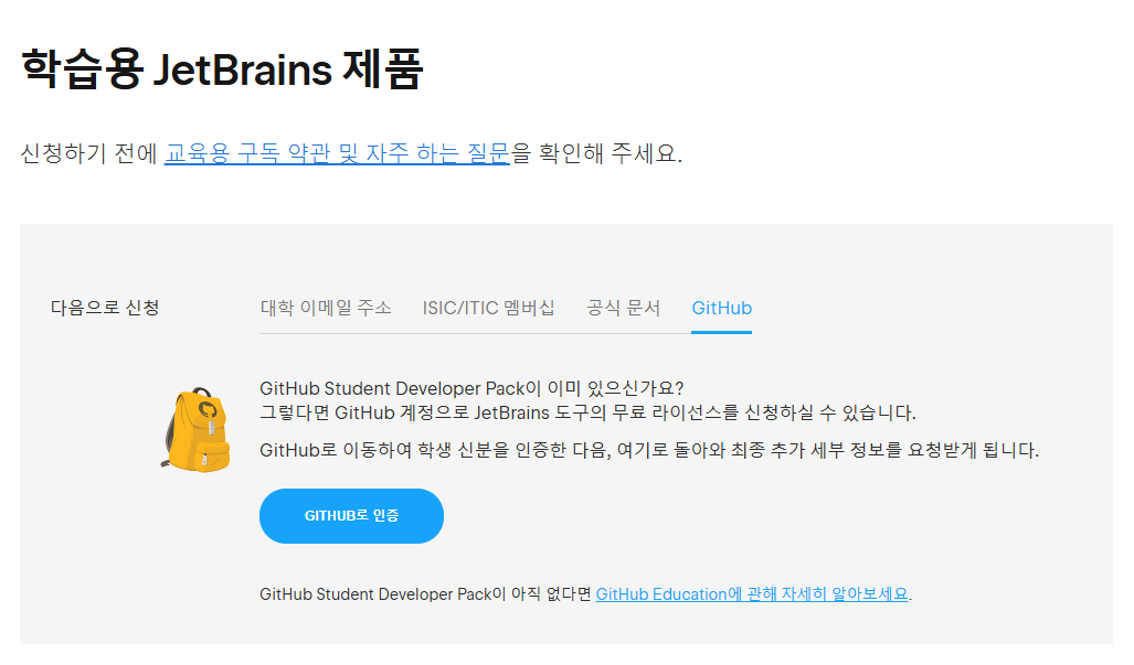 GitHub로 인증하기 위해서 GitHub Student Developer Pack이 존재하는 GitHub 계정이 필요합니다