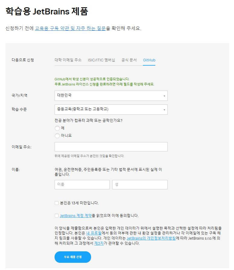 다시 입력창으로 돌아와서 "Github 학생 신분이 성공적으로 인증되었습니다" 라는 메시지가 나오면 개인 정보를 입력하고 무료 제품 신청을 눌러주면 됩니다 재학 중인 학교의 국가,학습 수준(중,고,학부생,대학원)을 선택해 줍니다