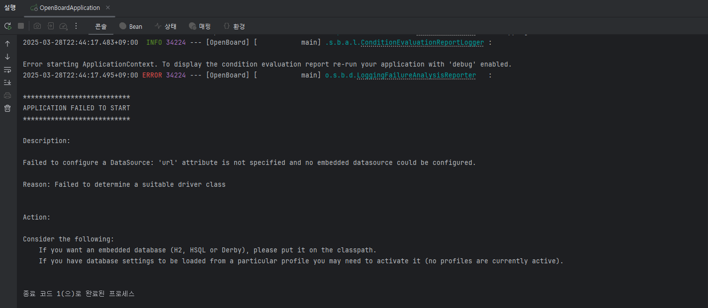 데이터베이스 의존성을 사용하는데 데이터베이스 연결 설정을 찾지 못해서 발생되는 에러 메시지입니다