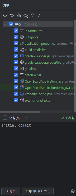 커밋 탭으로 이동해서 커밋 메시지를 작성하고 Push 작업을 통해 원격 저장소에 프로젝트를 업로드해 줍니다