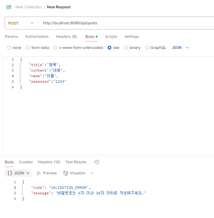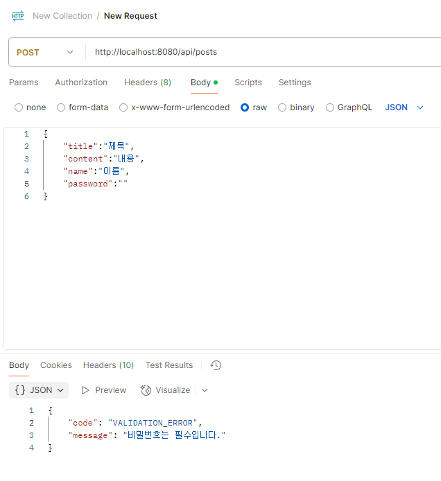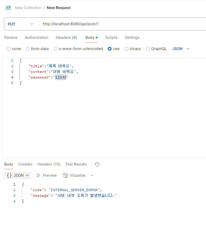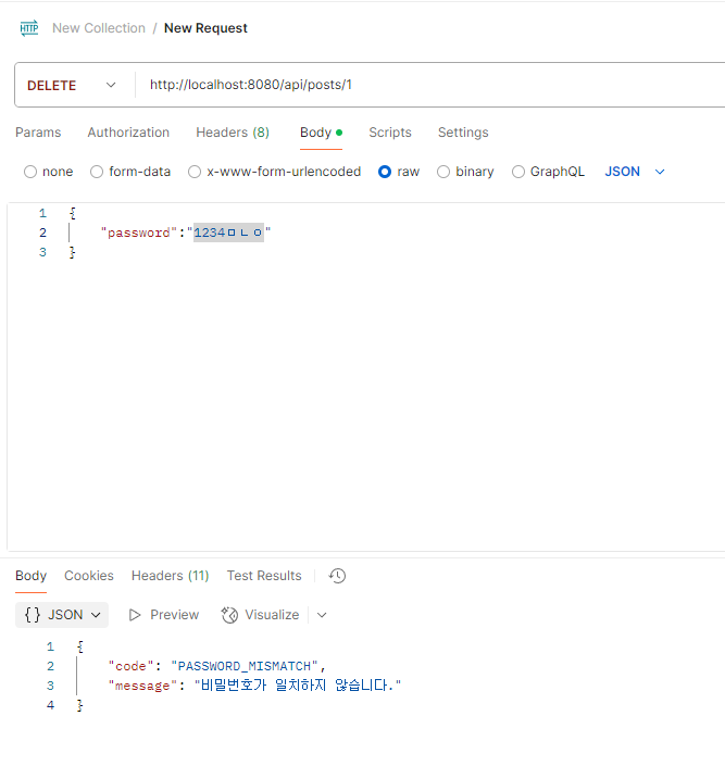 비밀번호 불일치,게시글을 찾을 수 없음의 예외를 처리하도록 구현했습니다