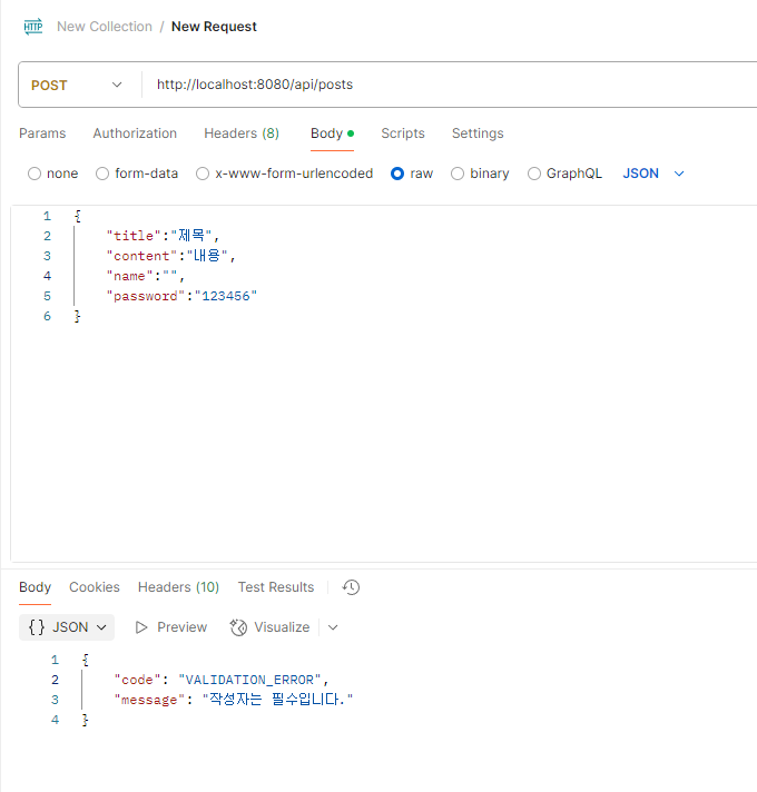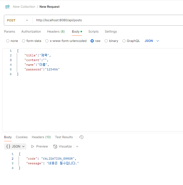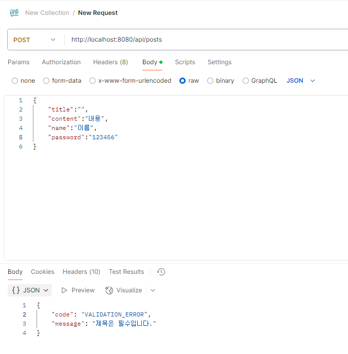 "code" "message"만 포함하여 응답하도록 구현했습니다