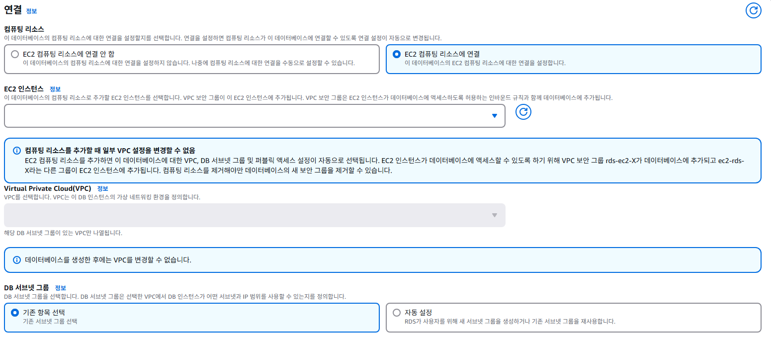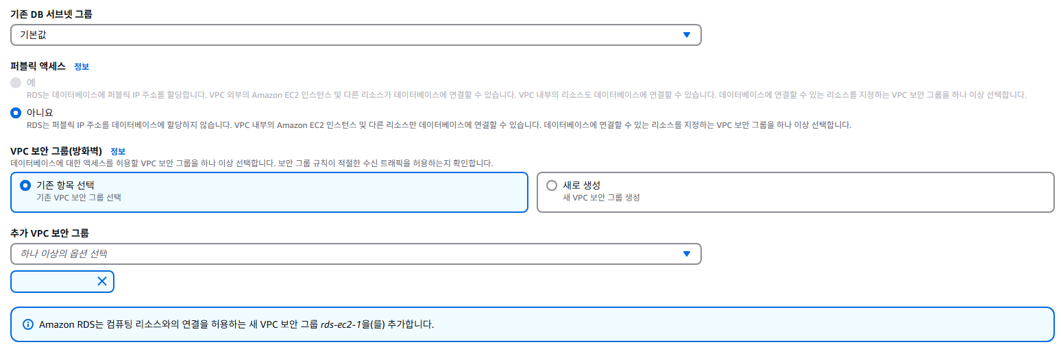 VPC 보안 그룹은 EC2에 적용했던 보안 그룹을 찾아서 설정
