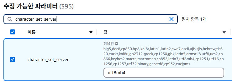 AWS의 RDS 기본 파라미터 설정으로 사용하게 되면 한글 깨짐이나 이모지 저장 오류,시간 오차등이 발생되기 때문에 직접 수정하여 커스터 마이징한 파라미터 그룹으로 설정해 주는 게 좋습니다
