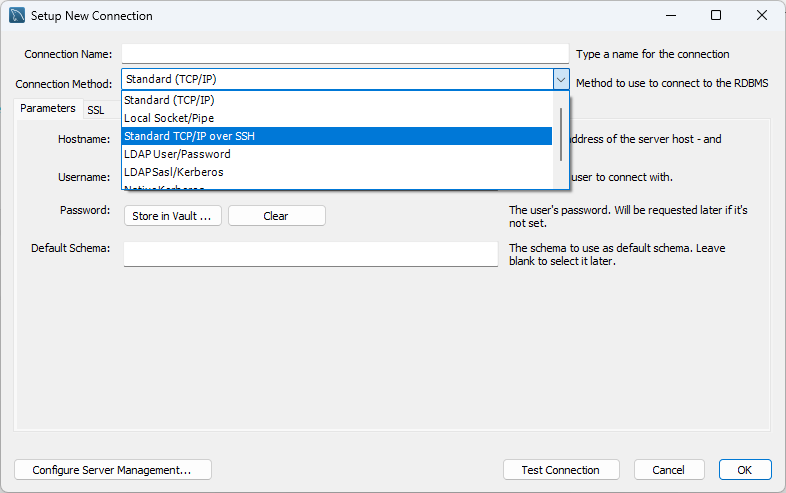 "Standard TCP/IP over SSH" SSH 방식으로 접속할 수 있도록 설정