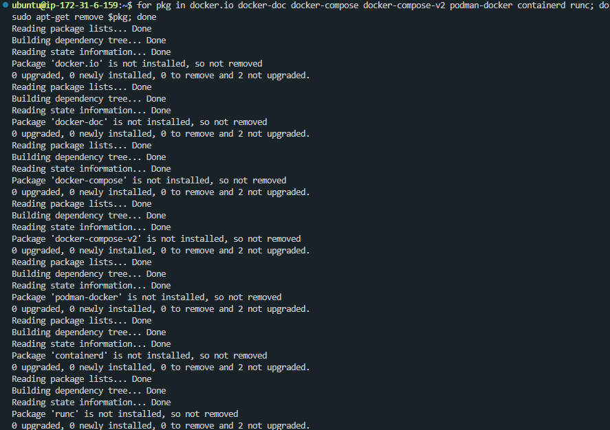 for pkg in docker.io docker-doc docker-compose docker-compose-v2 podman-docker containerd runc; do sudo apt-get remove $pkg; done