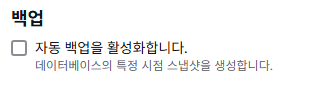 자동 백업은 프리 티어로 운영할 때 스냅샷이 일정량을 초과하면 그만큼 과금이 되기 때문에 비활성화하여 불필요한 과금을 방지합니다