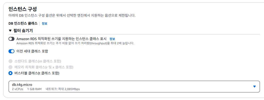 인스턴스 구성은 버스터블 클래스,db.t4g.micro는 프리 티어로 750시간/월 무료로 사용 가능합니다