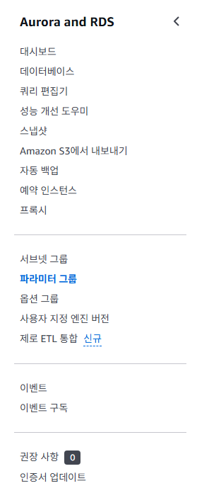 RDS 탭을 보면 파라미터 그룹이 있는데 클릭