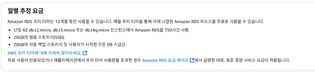다시 한번 프리 티어를 초과해서 사용하고 있지 않는지 확인하고 데이터베이스 생성을 눌러줍니다