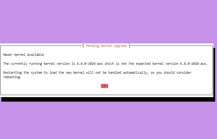 apt 업그레이드 진행 중 이런 창이 표시되었는데 운영체제의 커널이 업데이트되었지만 적용하기 위해서 시스템을 재부팅해야
