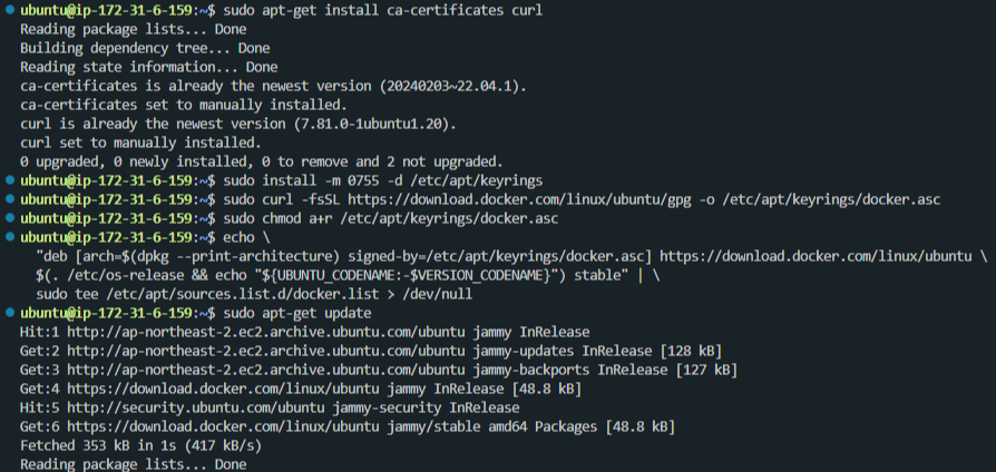 sudo apt-get install ca-certificates curl # HTTPS 저장소 GPG 키 다운로드 도구 설치