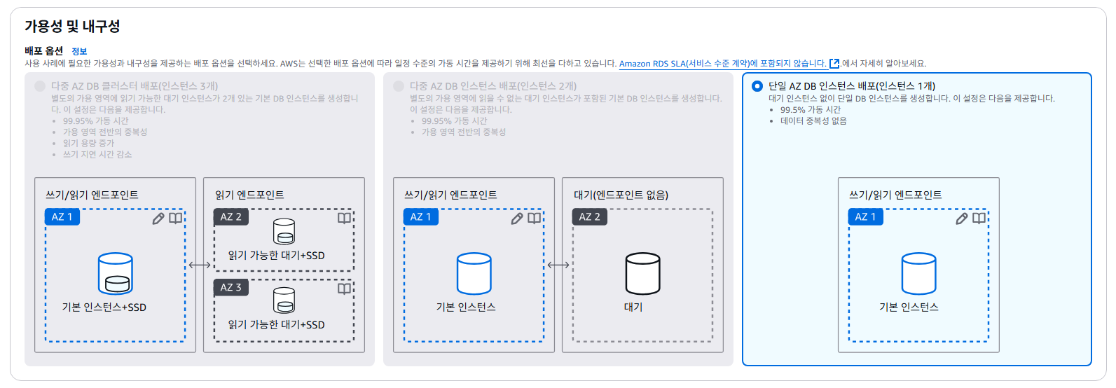 프리 티어를 선택하면 단일 AZ DB 인스턴스 배포만 활성화되는 걸로 보입니다