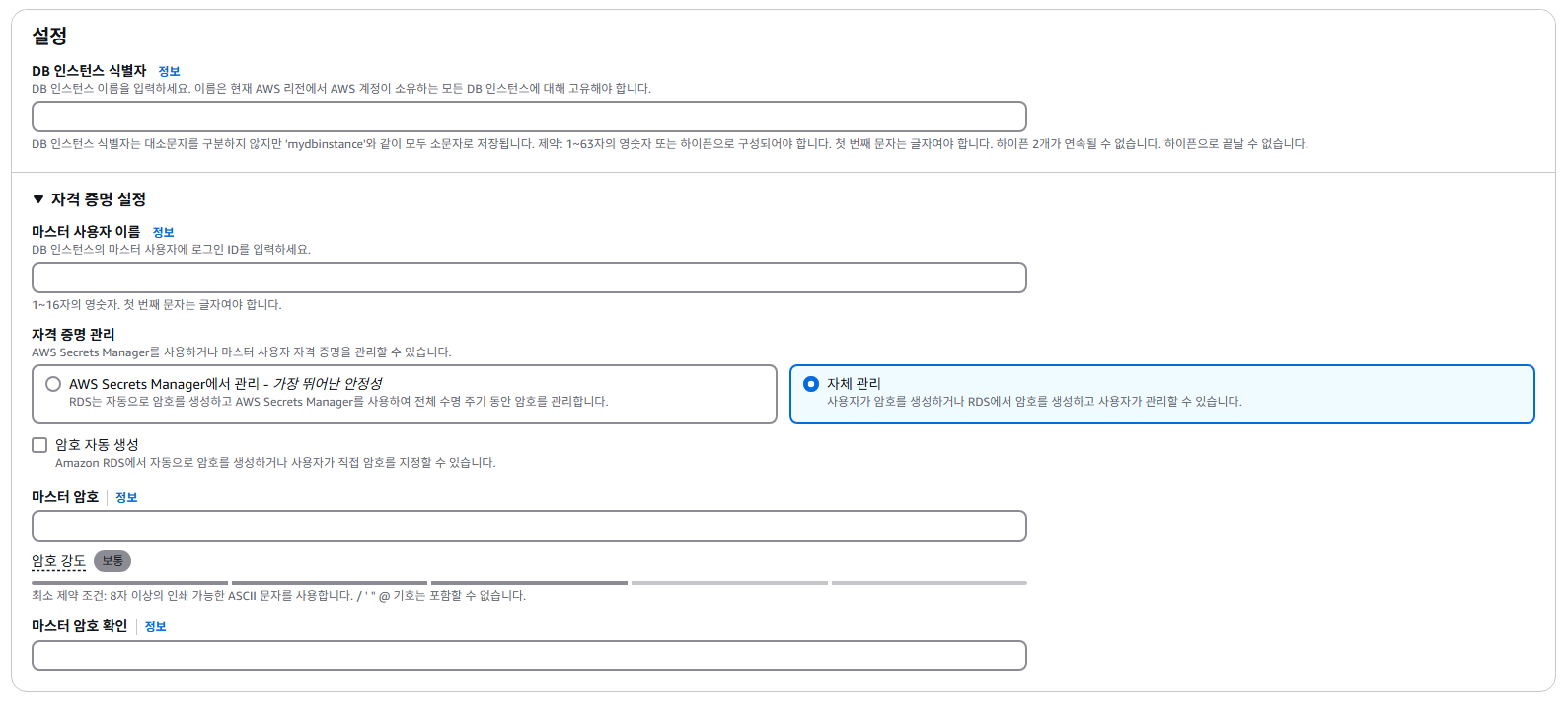 - 엔진 유형: RDS 엔진 유형에 맞춰서 선택