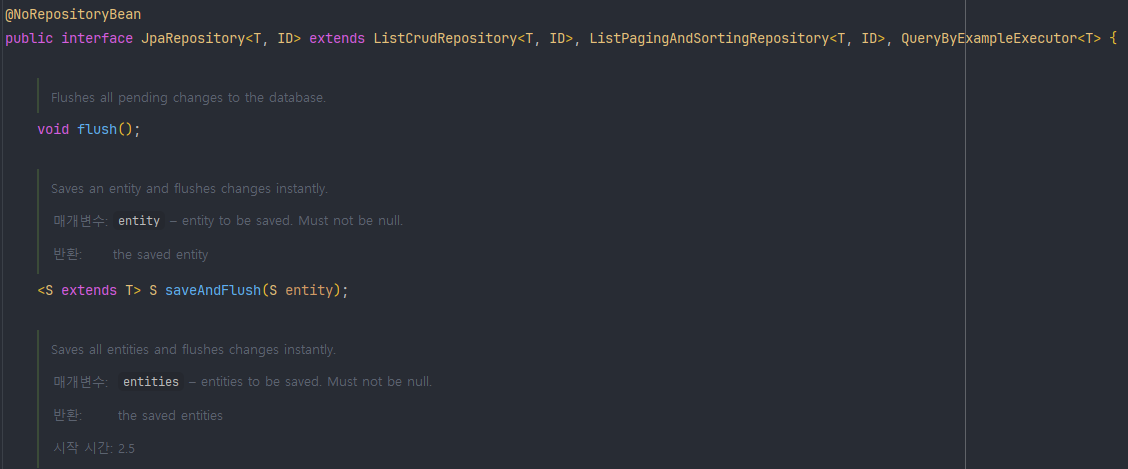 위에서 설명한 내용과 동일하게 T는 사용할 엔티티의 타입 ID는 엔티티의 PK의 타입을 정확히 지정하여 사용해야 합니다