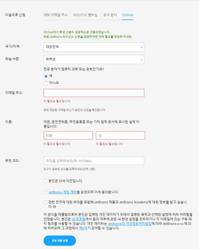 "Github 학생 신분이 성공적으로 인증되었습니다" 라는 메시지가 나오면 개인 정보를 입력하고 무료 제품 신청을 눌러주면 됩니다 재학 중인 학교의 국가,학습 수준(중,고,학부생,대학원)을 선택해 줍니다