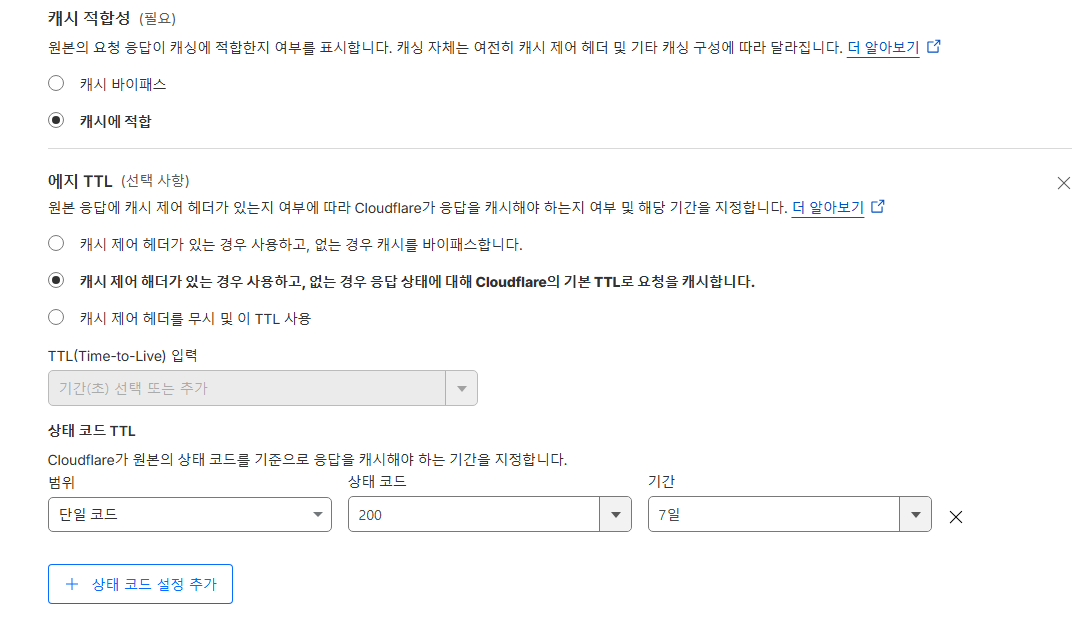 - "캐시 제어 헤더가 있는 경우 사용하고,없는 경우 응답 상태에 대해 Cloudflare의 기본 TTL로 요청을 캐시 합니다."