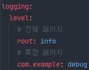 - root: info → 전체 패키지는 INFO 이상만 출력