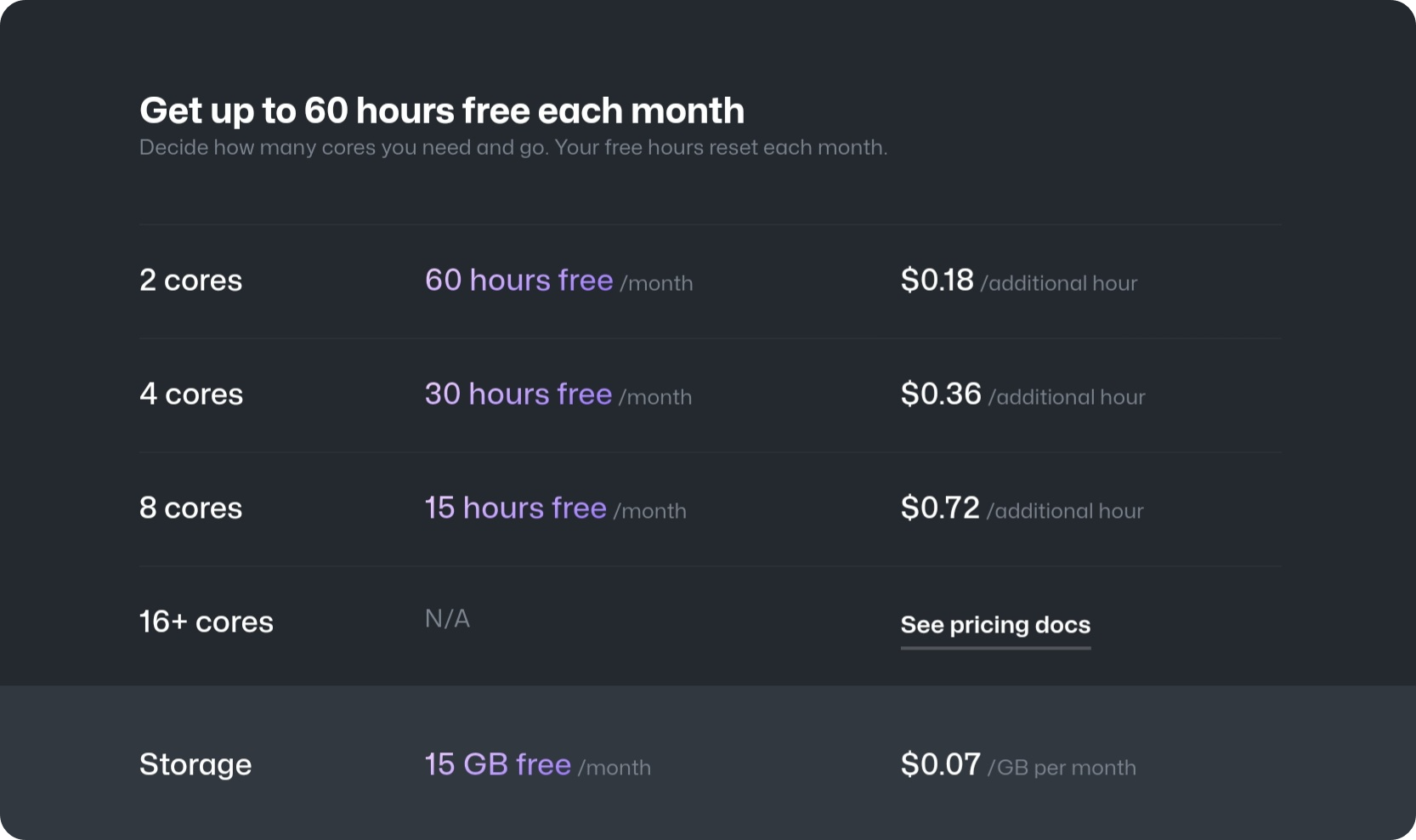 | 플랜 (Free,Pro) | 무료 월간 스토리지 | 무료 월간 코어 시간 |