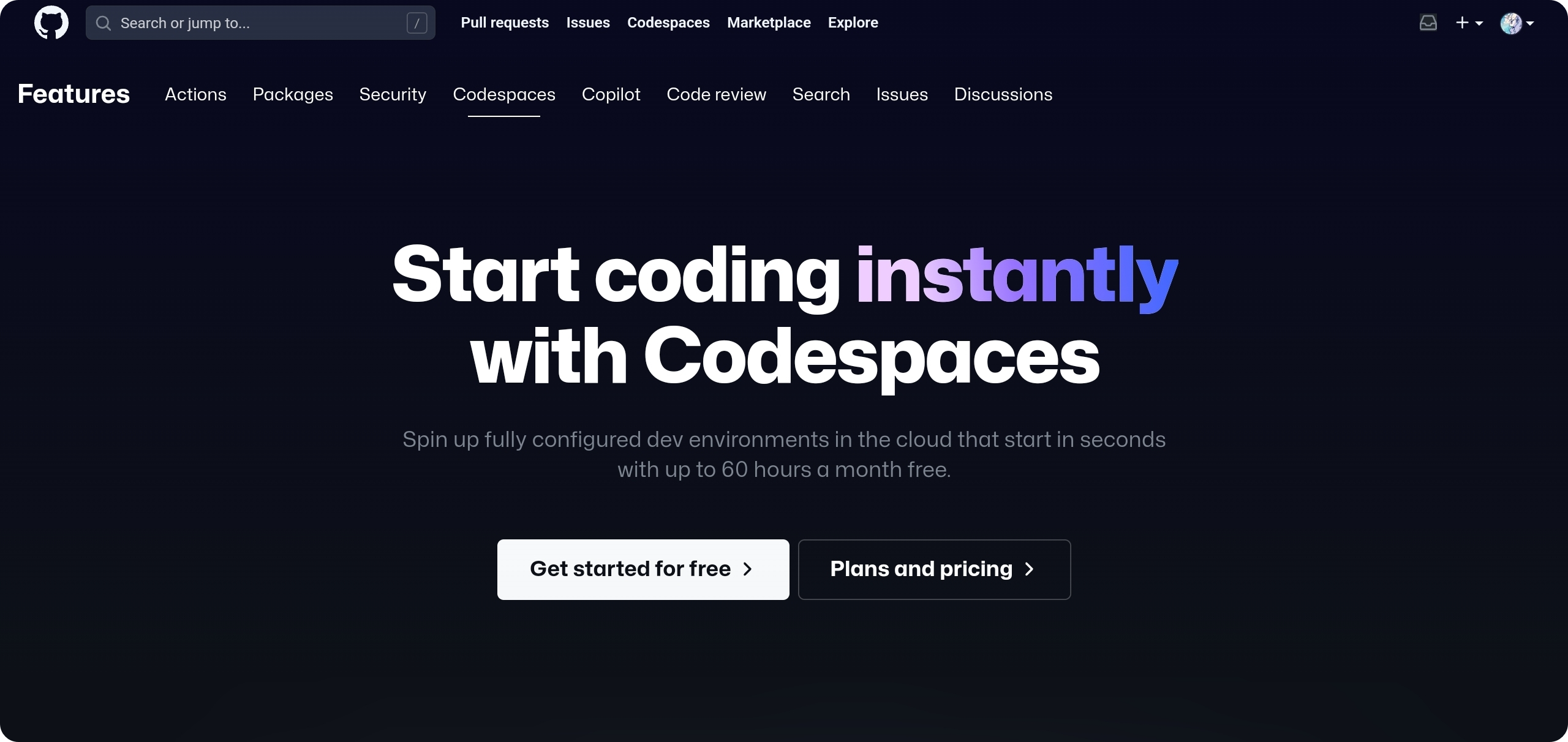 - GitHub CodeSpaces는 GitHub에서 제공하는 클라우드 환경에서 호스트 되는 개발 환경